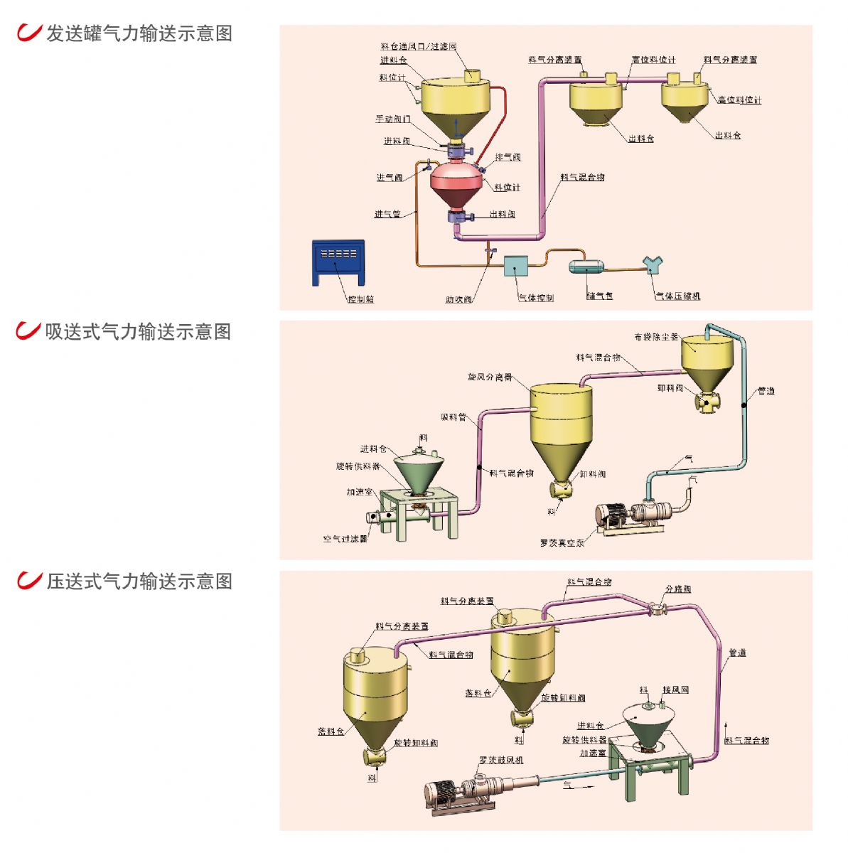 正壓和負壓也可進行組合應用以滿足特殊要求,比較適用于多點供料單點出料的輸送方式,通常為輸送粉狀、小顆粒或比重較輕的物料。